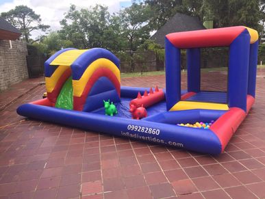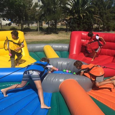 Lo llamamos combo porqeu tiene distintas actividades en un mismo inflable. Podes encontrarte con una pared para escalar, un aro de basket, cubos en distintas alturas para pisar y jugar con la estabilidad, saltos laterales a lo ninja Warrior y mucho mas!