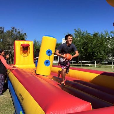 Para los amantes del basketball, este inflable es super divertido. Juegan 2 participantes, cada uno se coloca un cinturón de velcro que les permite estar unidos entre si mediante una cuerda elástica. Lo divertido es que mientras 1 de los jugadores corre y hace fuerza hacia adelante, empuja al otro jugador hacia atrás!